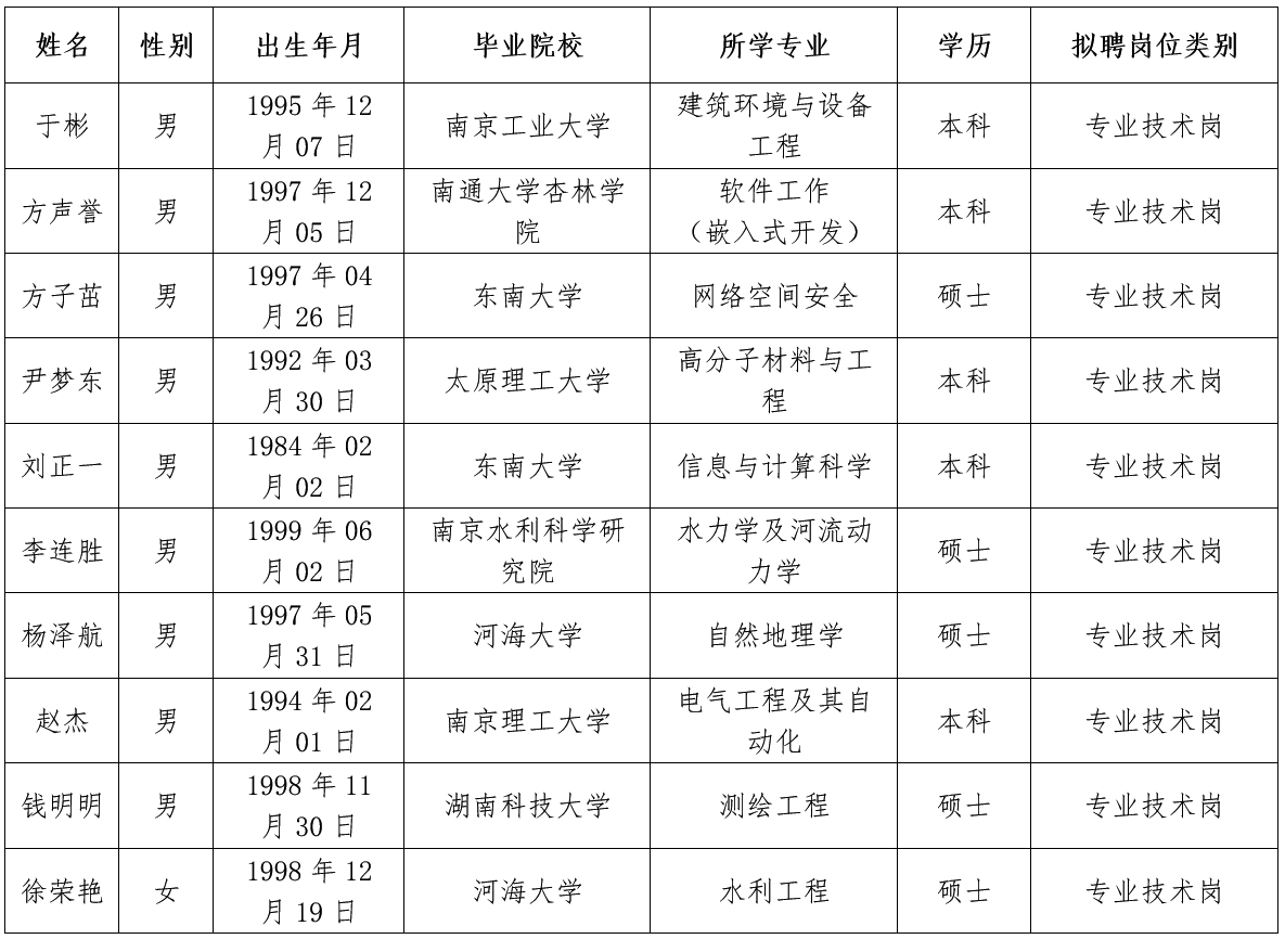 根據(jù)公開招聘工作有關(guān)要求,經(jīng)過報(bào)名、資格審核、面試、體檢等程序,確定于彬等10人為南京瑞迪水利信息科技有限公司擬錄用人員(按姓氏筆畫排序),具體如下: